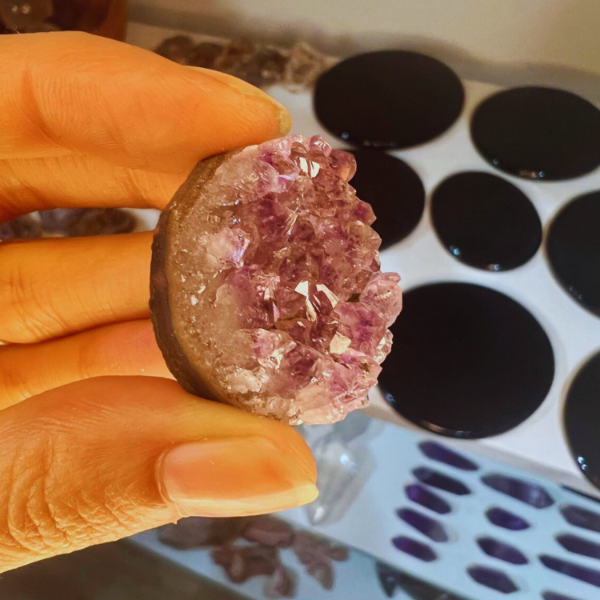 Pequeñas drusas de amatista llenas de luz. Cada una brilla distinto, con sus formas naturales y destellos únicos, como si guardaran dentro un pedacito de calma.
