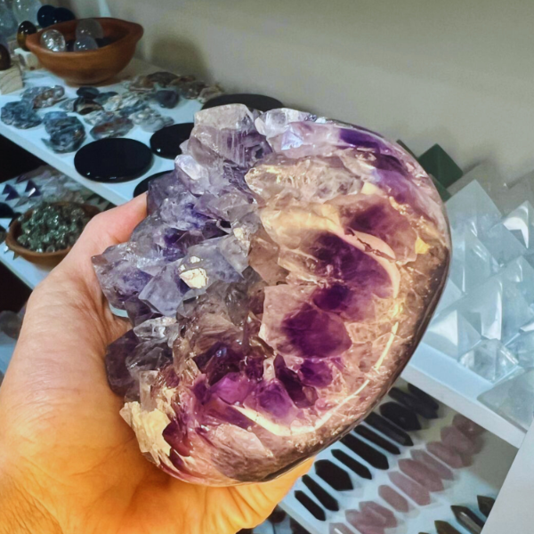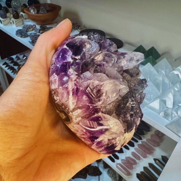 Una pieza que combina dos potencias: la forma del corazón, que representa amor y apertura emocional, y la drusa de amatista, que irradia calma, claridad y protección energética.