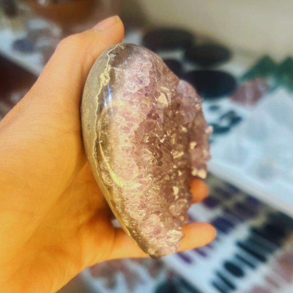 Una pieza que combina dos potencias: la forma del corazón, que representa amor y apertura emocional, y la drusa de amatista, que irradia calma, claridad y protección energética.