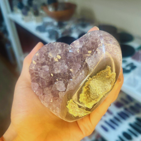 Una pieza que combina dos potencias: la forma del corazón, que representa amor y apertura emocional, y la drusa de amatista, que irradia calma, claridad y protección energética.