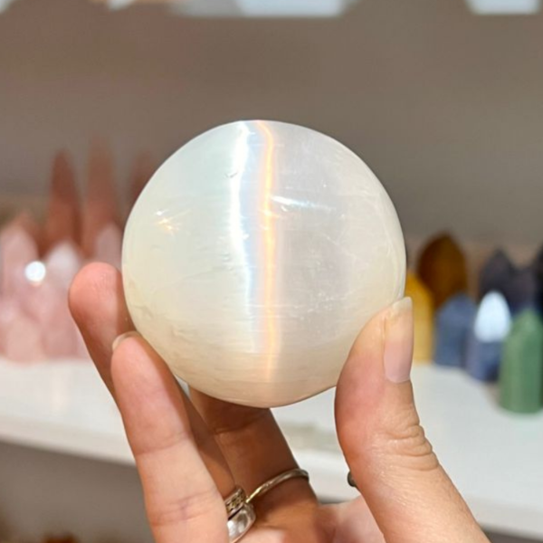 Cada esfera puede presentar variaciones naturales en vetas y transparencias propias de la selenita. 🤍✨
