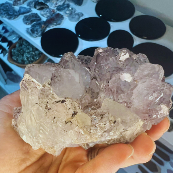 Las flores de amatista son una de las formaciones más delicadas y mágicas que existen. Nacen cuando los cristales crecen en distintas direcciones sobre una misma base.