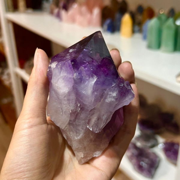 La amatista es muy elegida cuando buscamos calma mental, claridad y un ambiente más sereno. En formato pico, la energía se siente más direccionada, por eso muchas personas la usan para enfocar intención o trabajar de manera más puntual.
