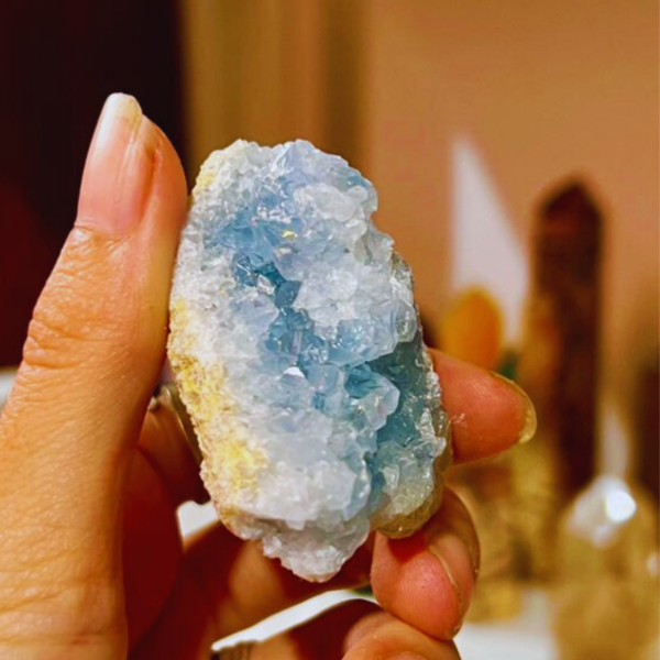 La celestina es una de esas piedras que se sienten antes de entenderse. Su color celeste suave y su brillo delicado generan una sensación inmediata de calma, como si el ambiente bajara un cambio apenas la apoyás.