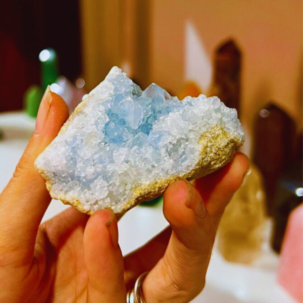 La celestina es una de esas piedras que se sienten antes de entenderse. Su color celeste suave y su brillo delicado generan una sensación inmediata de calma, como si el ambiente bajara un cambio apenas la apoyás.