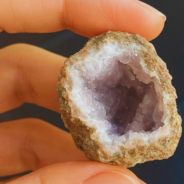 Por fuera, parecen simples piedras… pero al abrirlas, revelan su interior lleno de cristales. En cada una puede aparecer amatista rosa, calcita o cuarzo azúcar —cada una con su brillo y energía propia.