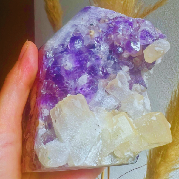 La calcita en este tipo de crecimiento es súper especial: aparece en bloques definidos, casi geométricos, que elevan la vibración de la amatista y le suman una energía de orden, claridad y dirección.