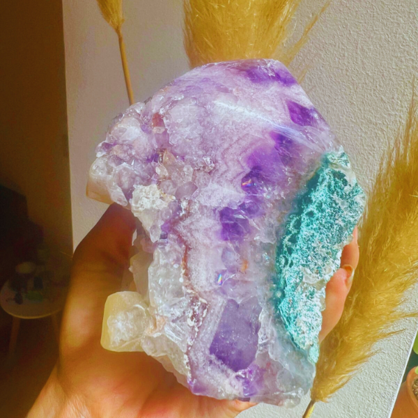 Es un contraste perfecto: lo etéreo del violeta con la claridad dorada de la calcita. Juntas generan una presencia visual y energética que transforma por completo el espacio.
