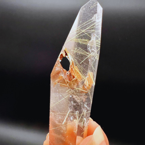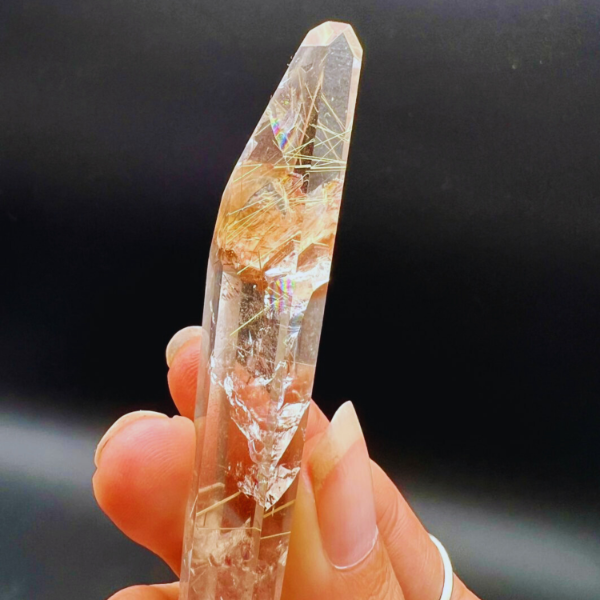 En su interior se ven agujas de rutilo dorado, finitas y bien marcadas, atravesando el cristal como hilos de luz. Y además tiene detalles que lo hacen verdaderamente único: una inclusión/cavidad interna muy particular, con tonos cálidos alrededor, más las fracturas naturales que le dan esa textura tipo “hielo” y generan destellos y arcoíris cuando le pega la luz.