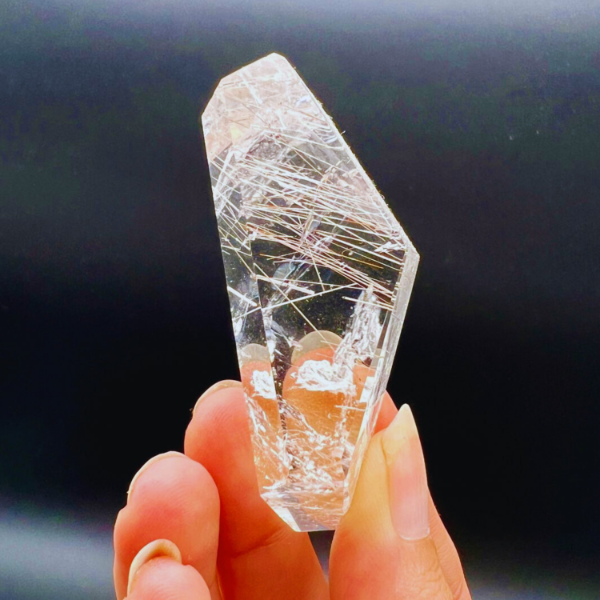 Esta pieza es de esas que no necesitan explicación cuando la ves. El cuarzo cristal totalmente transparente deja ver en su interior las agujas de rutilo que lo atraviesan en distintas direcciones, como hilos de luz suspendidos en el tiempo.