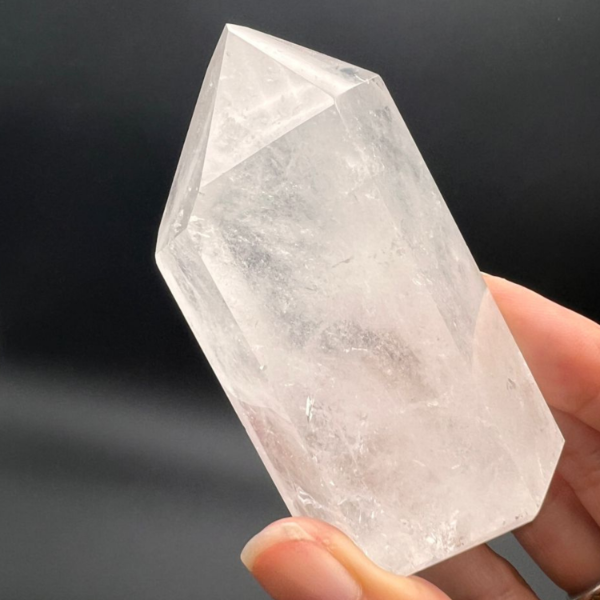Esta punta facetada de cuarzo cristal tiene seis caras bien definidas y base plana, lo que permite apoyarla fácilmente en un altar, escritorio o espacio personal.