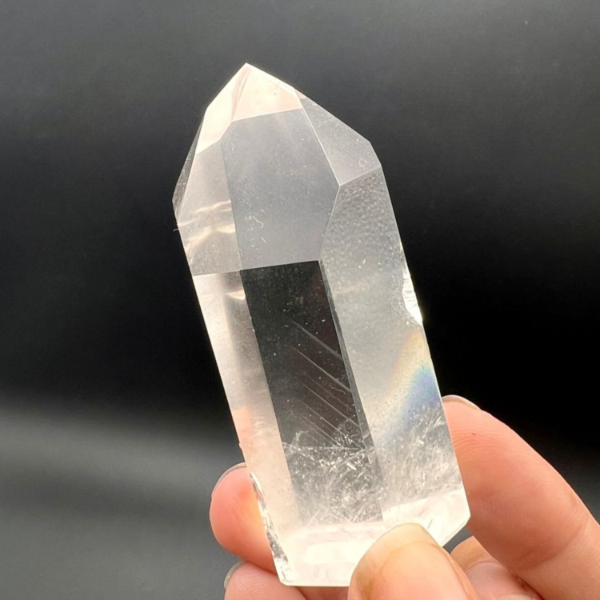Esta punta facetada de cuarzo cristal tiene seis caras bien definidas y base plana, lo que permite apoyarla fácilmente en un altar, escritorio o espacio personal.