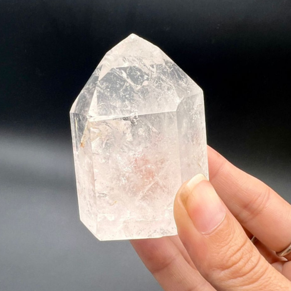 Esta punta facetada de cuarzo cristal tiene seis caras bien definidas y base plana, lo que permite apoyarla fácilmente en un altar, escritorio o espacio personal.