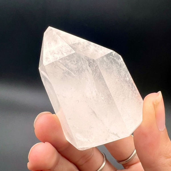 Esta punta facetada de cuarzo cristal tiene seis caras bien definidas y base plana, lo que permite apoyarla fácilmente en un altar, escritorio o espacio personal.