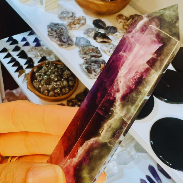 El maestro de fluorita arcoíris es pura claridad en movimiento. Sus capas de color reflejan diferentes frecuencias que trabajan a la vez: ordenan la mente, equilibran las emociones y limpian la energía del entorno. Es una piedra que acomoda todo lo que está disperso, ayudando a tomar decisiones desde un lugar más centrado.