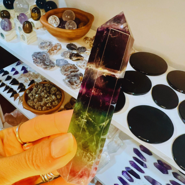 El maestro de fluorita arcoíris es pura claridad en movimiento. Sus capas de color reflejan diferentes frecuencias que trabajan a la vez: ordenan la mente, equilibran las emociones y limpian la energía del entorno. Es una piedra que acomoda todo lo que está disperso, ayudando a tomar decisiones desde un lugar más centrado.