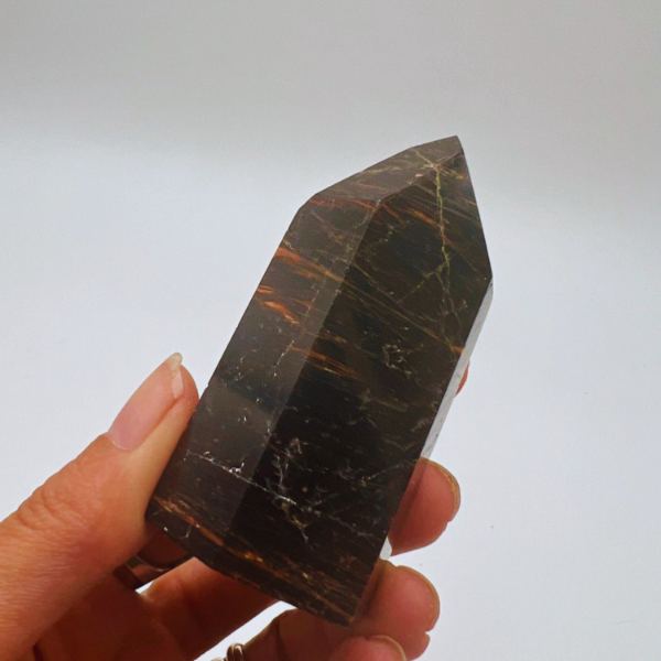Esta punta facetada maestra de turmalina tiene seis caras bien definidas, base plana para apoyarla y terminación en punta para direccionar la energía de manera clara.