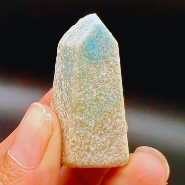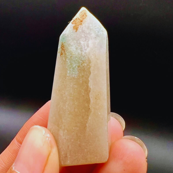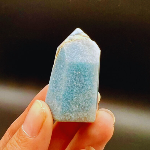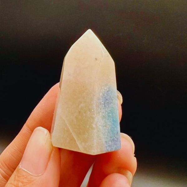 Esta punta facetada de cuarzo troleíta tiene una presencia más sólida y profunda. No es un cuarzo transparente, sino una combinación más compacta, con tonos azulados, blancos y a veces grises que le dan un aspecto más terroso y contenido.